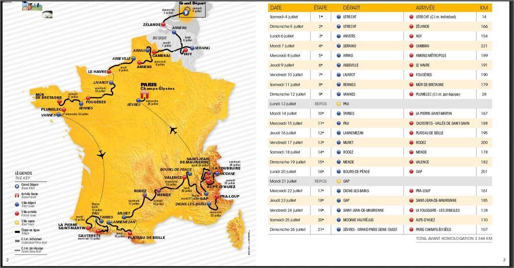 Au terme de ces trois semaines de course, les coureurs auront parcouru 3344 km, auront gravi 26 cols ou côtes (7 dans les pyrénées, 3 dans le massif central et 16 dans les alpes).